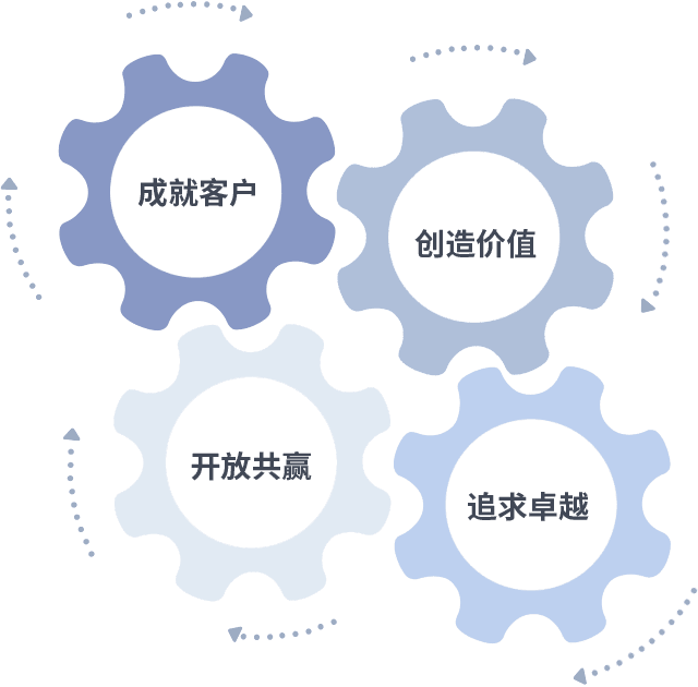 成就客户是一切决策的出发点,,创造价值是衡量所有工作的标准,,,追求卓越是我们做事做人的态度,,,,开放共赢是我们的格局也是最终的结果。。。。价值观的齿轮环环相扣,,,推动着组织里的每个人不断向前。。。。