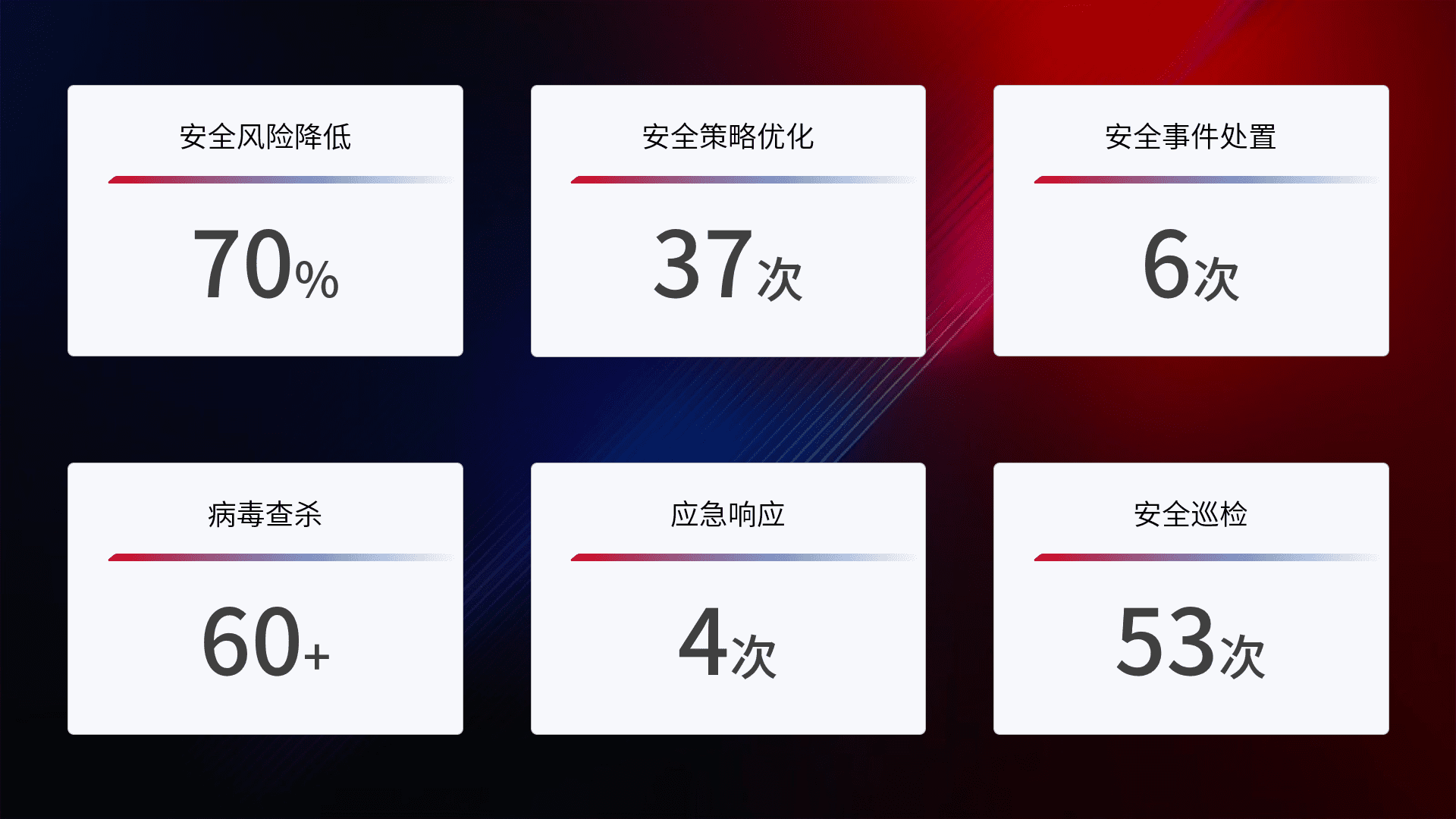 提供全面的安全事件报告体系,,,,包括处置报告、、、周报、、、季度和年度总结,,结合持续监控,,,,帮助客户深入了解网络安全状况。。。